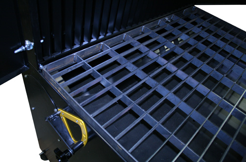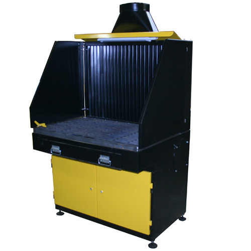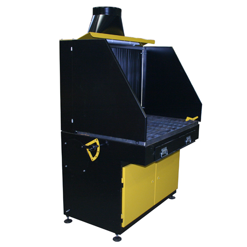 Окалины и тяжелые частицы пыли оседают в выдвижном поддоне, а дым и легкие частицы удаляются вытяжной системой, к которой стол может быть подключен с боковых сторон, с задней части или сверху.