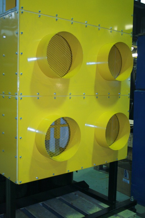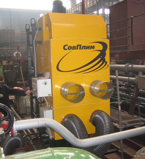 Фильтр воздуха с индивидуальным вытяжным вентилятором (на фото в начале страницы). Вытяжной вентилятор расположен сверху корпуса фильтра, а входной и выходной (-ные) патрубки с торцевой части фильтра. |