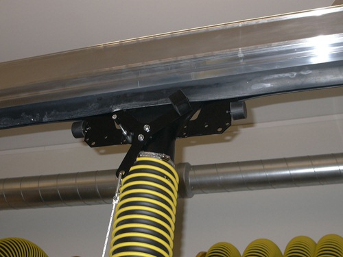 Станция технического обслуживания оборудована пряморельсовой системой удаления выхлопных газов «MRP». Вытяжной шланг «EH-100-7.5» с газоприемной насадкой «REC-100-115» закреплен на подвижной каретке «MIC-100». |