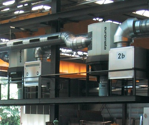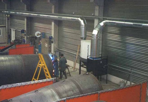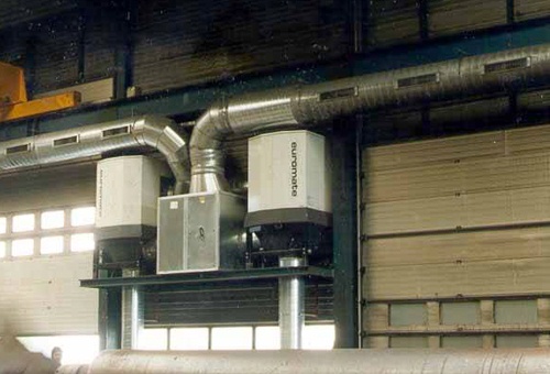 Механические фильтры «SCS» на сварочном производстве. Фильтры подключены к промышленным вентиляторам «FAN-120» в шумозащитных корпусах. |