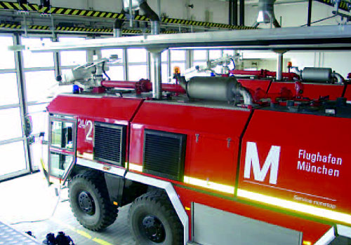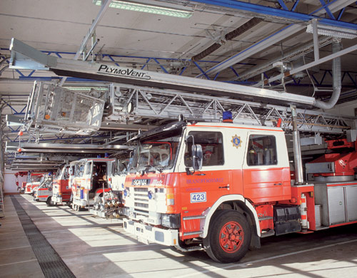 Гараж пожарной станции оборудован рельсовыми системами удаления выхлопных газов «VSR-9». |